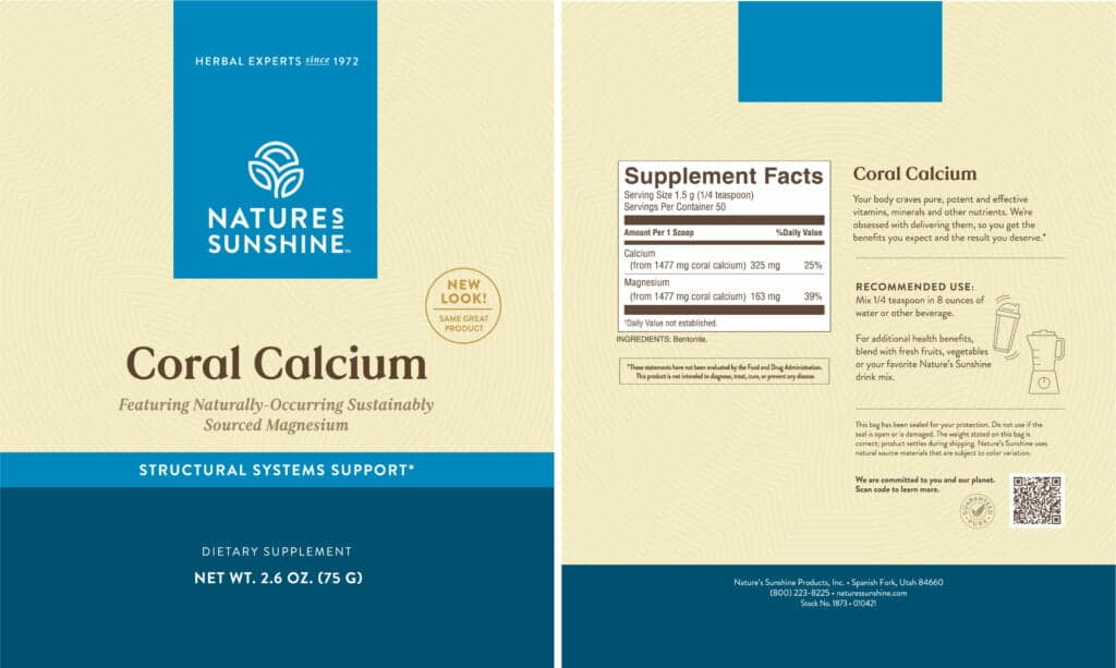 El calcio coralino de Nature's Sunshine proporciona un apoyo esencial para la salud de los huesos. Especialmente formulado para mantener los niveles de acidez, el coral calcium es naturalmente alcalino. Los 325 mg de calcio, los 163 mg de magnesio, y la arcilla montmorillonita nutren el sistema estructural para promover la salud de los huesos. La arcilla de montmorillonita asiste en los procesos de desintoxicación del sistema digestivo para que el cuerpo funcione correctamente. Todas las personas con antecedentes de osteoporosis, los hombres y mujeres de edad avanzada, y las mujeres blancas y asiáticas desde la preadolescencia hasta madiados de la treintena encontrarán numerosos beneficios en Coral Calcium, especialmente si se toma junto con ejercicio regular y una dieta nutritiva.