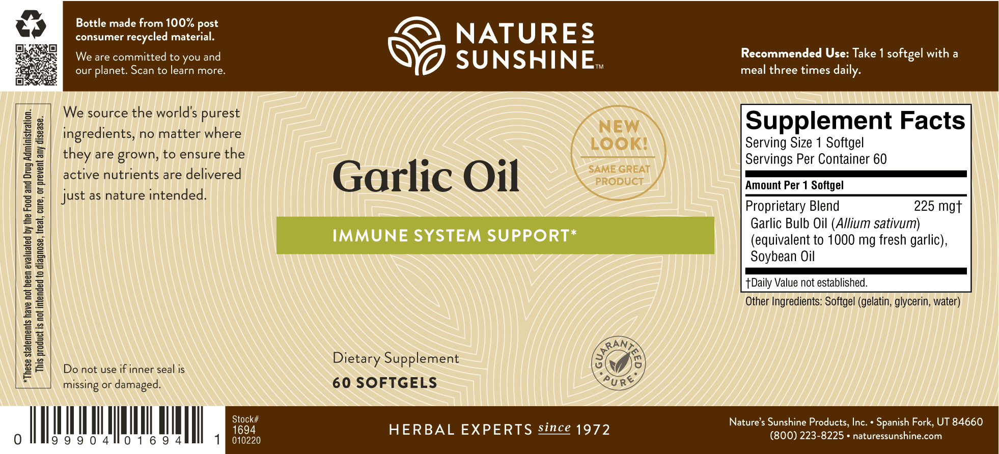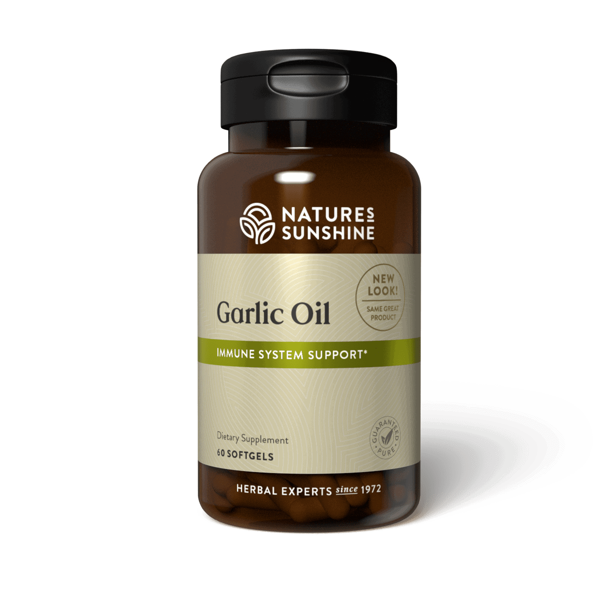 El aceite de ajo es una rica fuente del antioxidante germanio y compuestos de azufre. Combinado con aceite de soja para cumplir con las especificaciones de la etiqueta de 1.000 mg de aceite de ajo, el aceite de ajo de Nature's Sunshine puede utilizarse para obtener beneficios para la salud interna o externa.