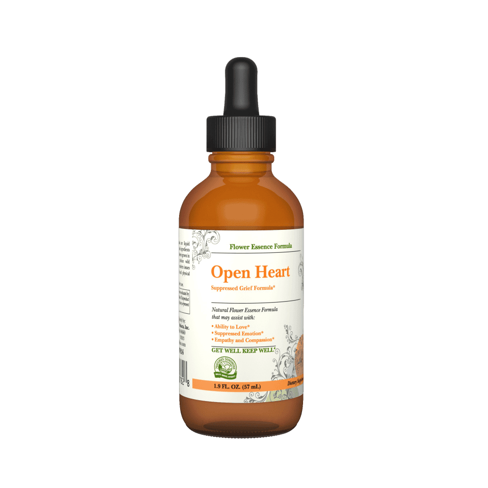 Open Heart de Nature's Sunshine puede ayudar a superar el sufrimiento emocional. Las esencias de las flores California Wild Rose, Baby Blue Eyes, Yerba Santa, Star Tulip, Evening Primrose, Pink Monkeyflower, y Golden Ear Drops se unen en Open Heart para ayudar a aliviar la pesadumbre mientras que apoyan la compasión y la empatía.