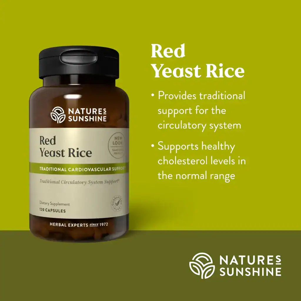 Red Yeast Rice de Nature's Sunshine ayuda a regular los niveles de colesterol ya normales y nutre el sistema circulatorio. El arroz de levadura roja, Monoascus purpureus, ayuda a la producción del colesterol bueno en el hígado. Una cápsula de Red Yeast Rice contiene 600 mg.