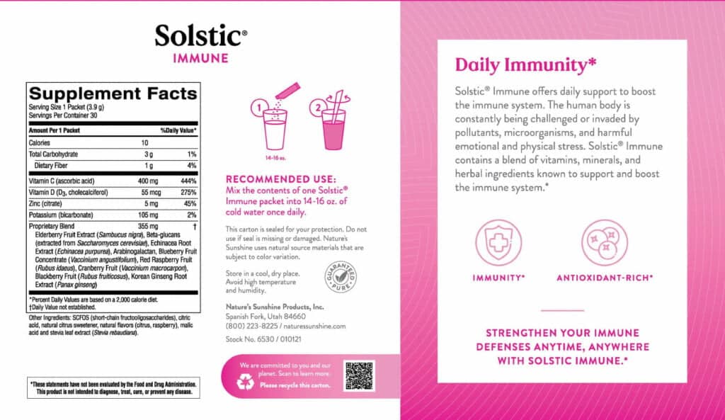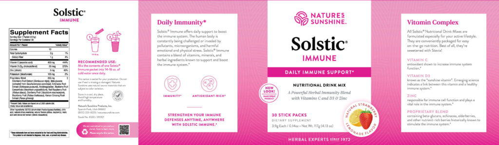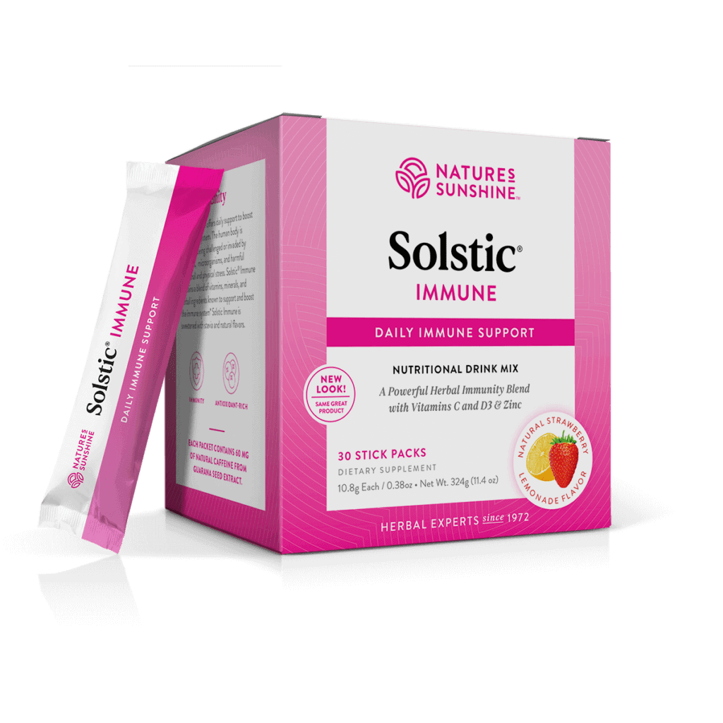 Solstic Immune de Nature's Sunshine proporciona apoyo inmunológico para las personas que siempre están en movimiento. Lo entendemos: la vida es muy ajetreada. Y a veces es demasiado ocupada para pensar en reforzar el sistema inmunológico hasta que empiezas a toser y estornudar. Por eso hemos creado Solstic Immune, un refuerzo inmunitario en un práctico paquete para bebidas que puede llevar a todas partes. Sus ingredientes claves son el extracto de bayas de saúco, la equinácea purpúrea, y la vitamina D3, todos los cuales son un apoyo para el sistema inmunitario. Solstic Immune también contiene arabinogalactán y betaglucanos, que estimulan la actividad de las células asesinas naturales y de los macrófagos; ginseng Panax, otro promotor de la actividad de las células asesinas naturales; vitamina C, conocida desde hace tiempo por su papel en el mantenimiento de un sistema inmunitario sano; zinc, responsable de la función de los neutrófilos, las células asesinas naturales, y los linfocitos T y B; y frutos de arándanos, moras, frambuesas, y arándanos rojos, que están llenos de antioxidantes y antocianinas que ayudan a reforzar el sistema inmunitario. No importa lo ajetreada que sea la vida, coger un paquete de Solstic Immune y mantener las defensas fuertes.