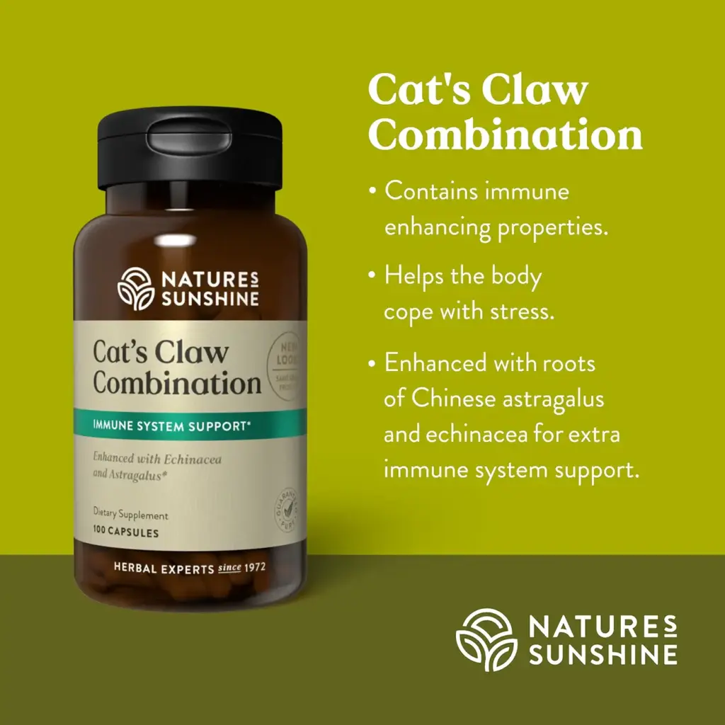 La Uña de Gato de Nature's Sunshine es la igual a las hierbas más populares que refuerzan el sistema inmunitario, como la equinácea, la foca dorada, el pau d'arco, el ajo, y el eleuthero. También contiene propiedades similares al cartílago de tiburón y al ácido caprílico. Las investigaciones actuales indican que puede desempeñar un papel valioso en el apoyo al sistema inmunológico del cuerpo. La Uña de Gato de Nature's Sunshine está mezclada con astrágalo y equinácea para un apoyo inmunológico extra.