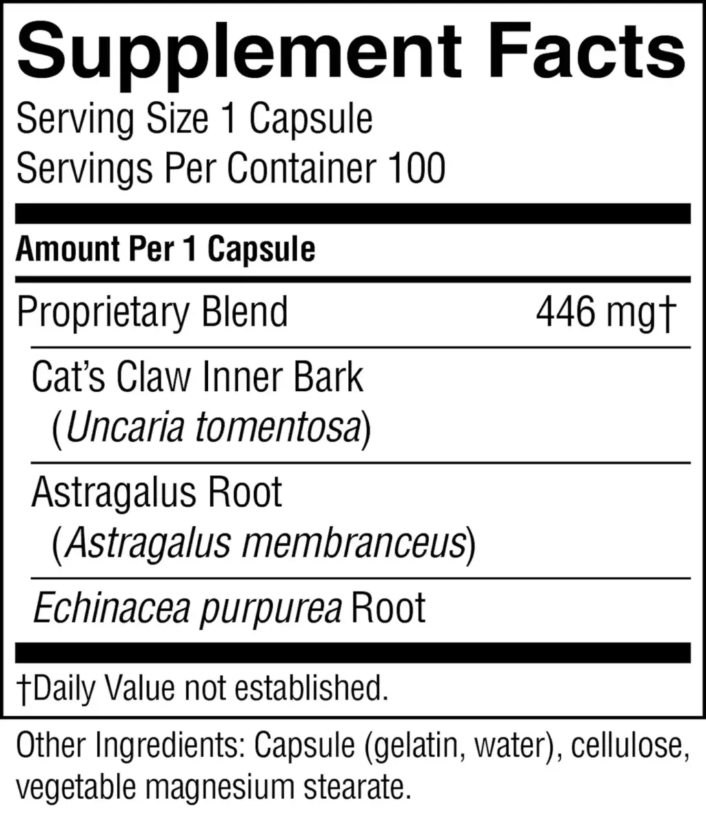 | Mezcla patentada: Corteza interna de uña de gato, raíz de astrágalo, equinácea purpúrea raíz | 446 mg |