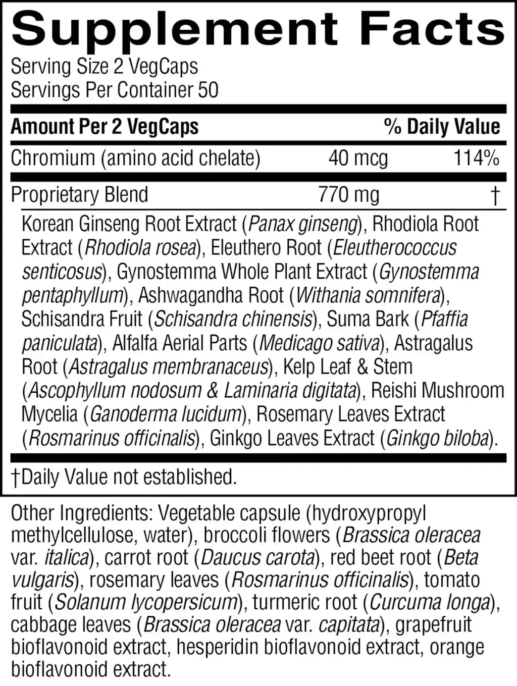 | Proprietary Blend: Korean ginseng root extract, rhodiola root extract, eleuthero root, gynostemma whole plant extract, ashwagandha root, schisandra fruit, suma bark, alfalfa aerial parts, astragalus root, kelp leaves and stems, reishi mushroom mycelia, rosemary leaves extract, ginkgo leaves extract | 770 mg |