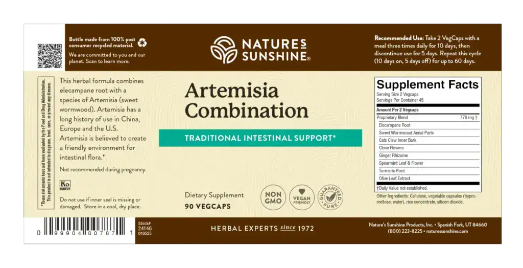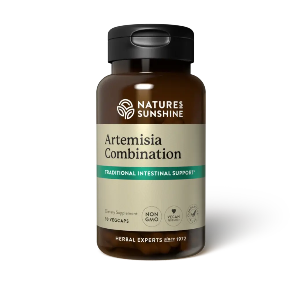 Nature’s Sunshine Artemisia Combination features two species of artemisia that support intestinal flora. Both wormwood (Artemisia annua) and mugwort (Artemisia vulgaris) are traditionally used for the benefits they provide to the intestinal system. Artemisia Combination also contains elecampane root, clove bud, garlic bulb root, ginger root, spearmint, turmeric root, and olive leaf extract. This rich combination of nutrients helps support the digestive system. Additionally, it helps support healthy immune function.