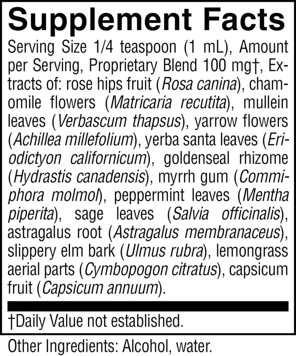 | Proprietary Blend: Extract of rose hips, chamomile flowers, mullein leaves, yarrow flowers, yerba santa leaves, goldenseal root, myrrh gum, peppermint leaves, sage flowers, astragalus root, slippery elm bark, lemongrass aerial parts, capsicum fruit | 100 mg |