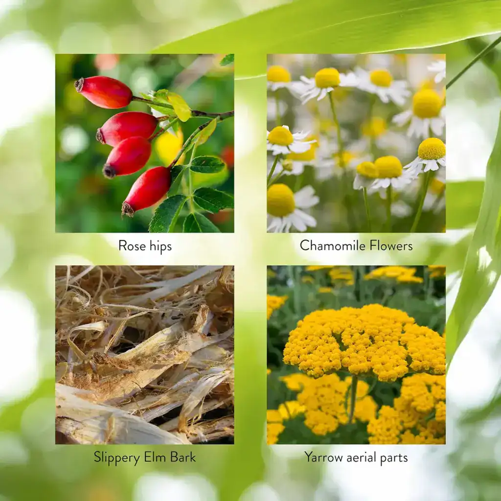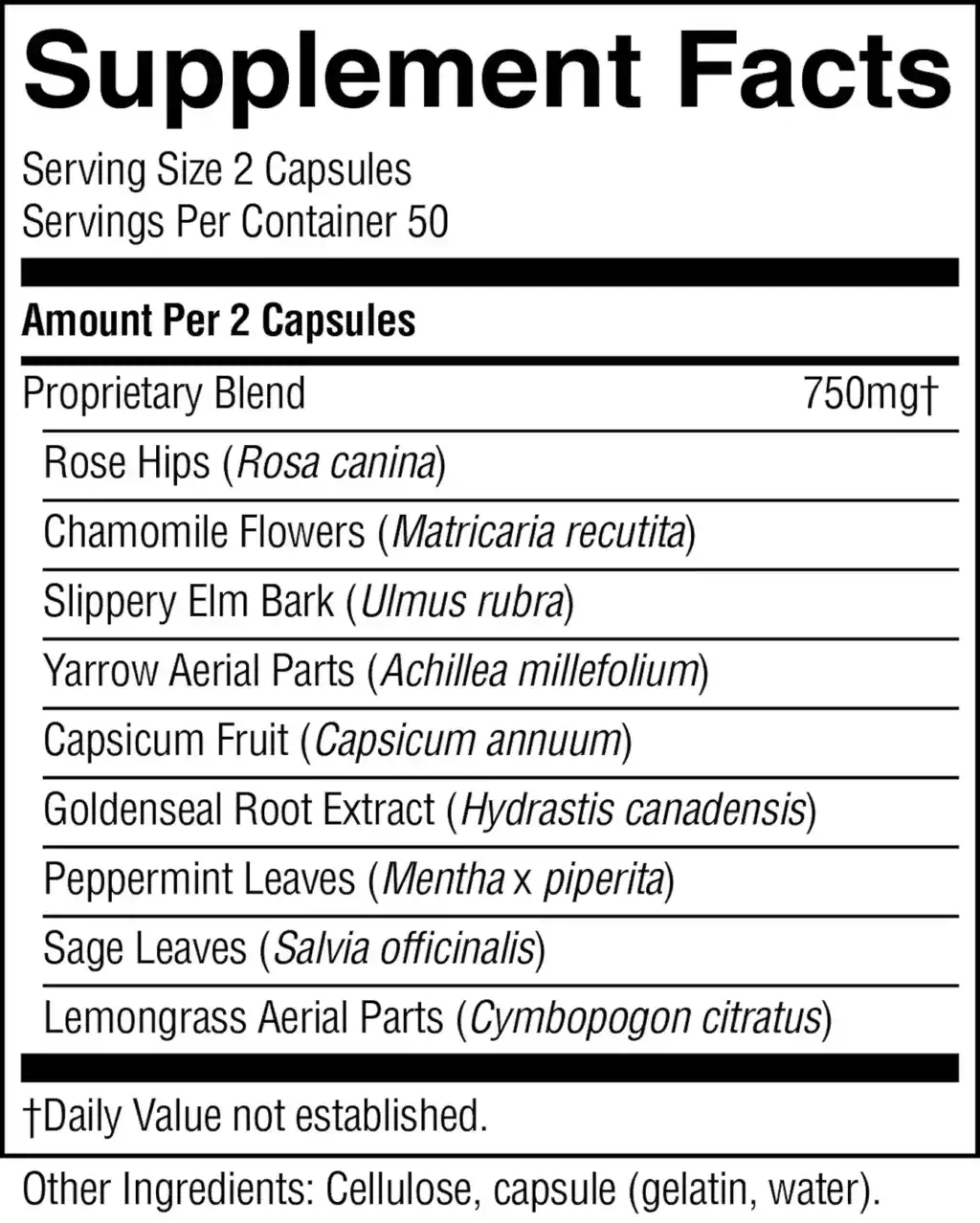 | Proprietary Blend: Rose hips, chamomile flowers, slippery elm bark, yarrow aerial parts, capsicum fruit, goldenseal root and rhizome, peppermint leaves, sage leaves, lemongrass aerial parts | 750 mg |