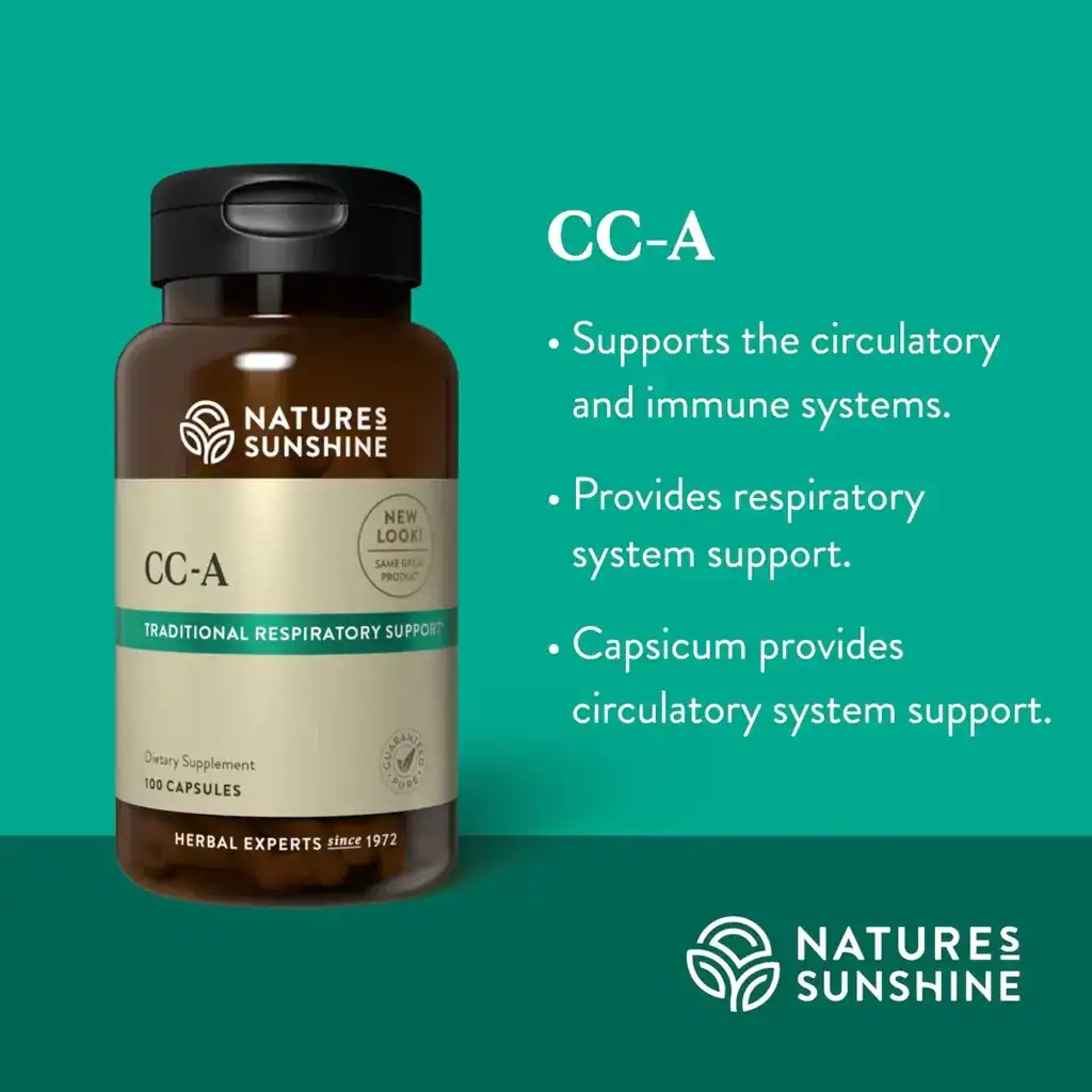 Nature’s Sunshine CC-A nourishes the circulatory and immune systems as well as providing respiratory support. This herbal blend includes capsicum for circulatory support; goldenseal, sage, and rose hips for immune support; and yarrow for respiratory support. CC-A also contains vitamins and trace minerals.