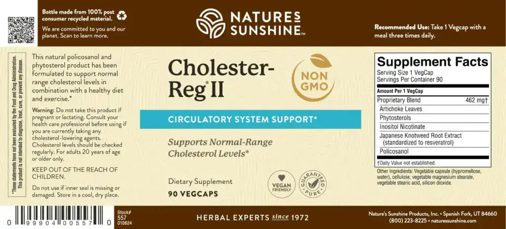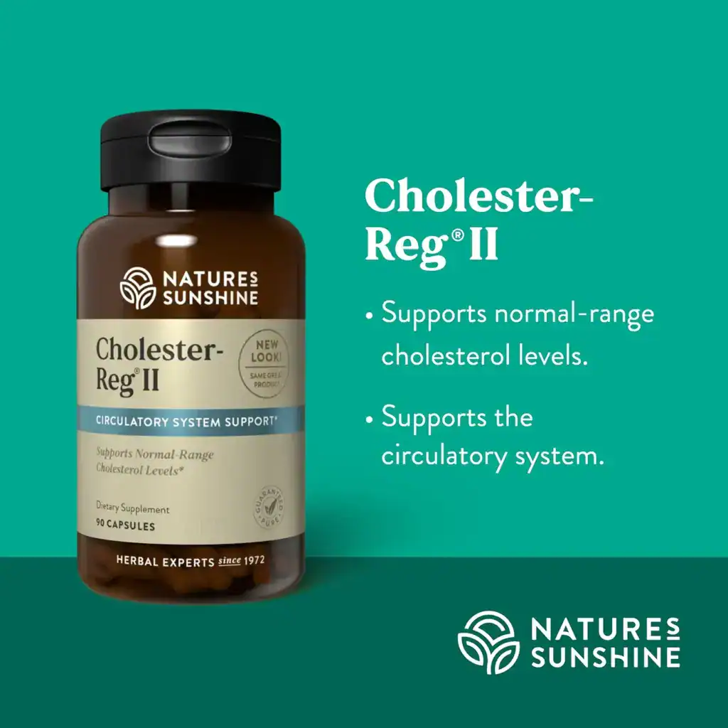 A formula that consists of policosanol, phytosterol (plant sterols), inositol nicotinate (a form of niacin), resveratrol, and artichoke powder, Cholester-Reg II supports the heart and the circulatory system. It sustains normal cholesterol levels, contains antioxidants, and ensures that normal platelet aggregation levels are maintained. Each Nature’s Sunshine Cholester-Reg II capsule is 462 mg.