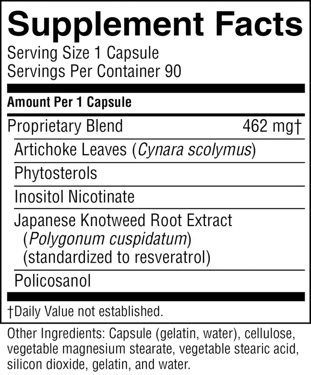 | Proprietary Blend: Artichoke leaves, phytosterols, inositol nicotinate, resveratrol, policosanol | 462 mg |