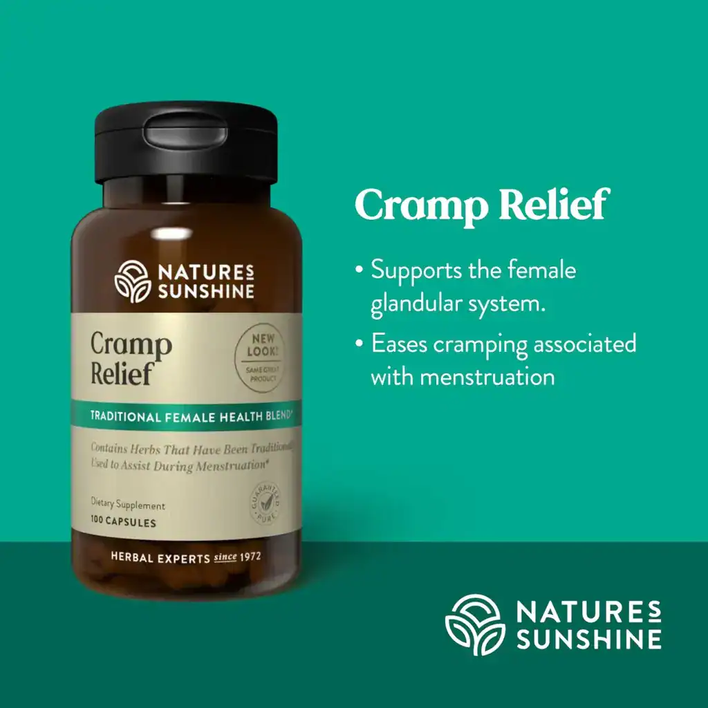 Nature’s Sunshine Cramp Relief blends herbs that alleviate muscle contraction and cramping during the menstrual cycle. With its unique blend of wild yam, black cohosh, cramp bark, lobelia aerial parts, and plantain leaves, Cramp Relief helps manage other menstrual symptoms including mood changes. It provides overall support to the female reproductive system.