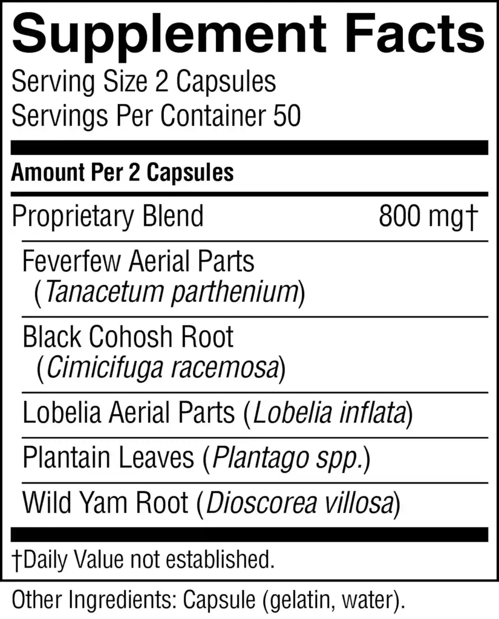 | Proprietary Blend: Feverfew aerial parts, black cohosh root, lobelia aerial parts, plantain leaves, wild yam root | 800 mg |