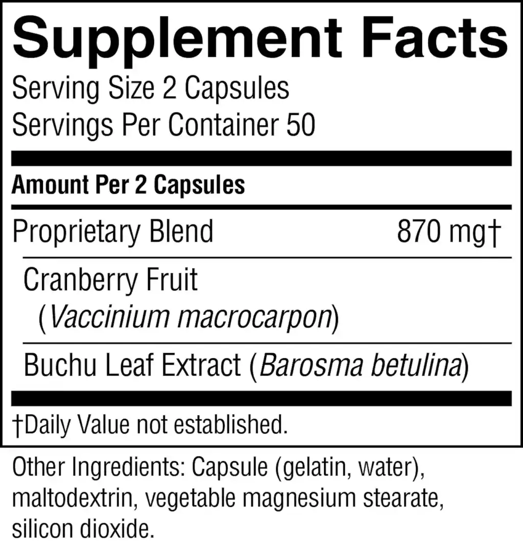 | Proprietary Blend: Cranberry fruit, buchu leaf extract | 870 mg |