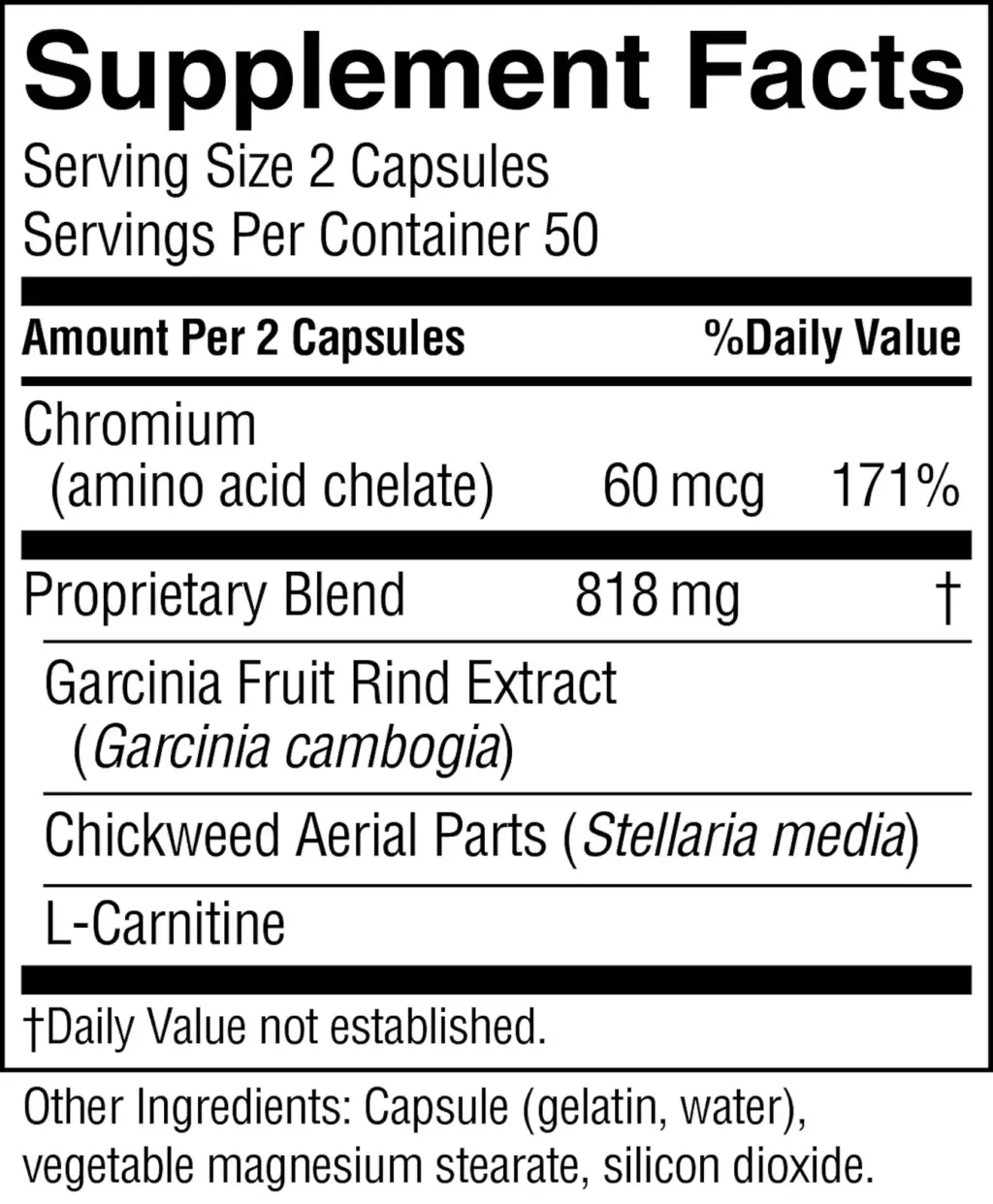 | Proprietary Blend: Garcinia fruit rind extract, chickweed aerial parts, I-carnitine | 818 mg |