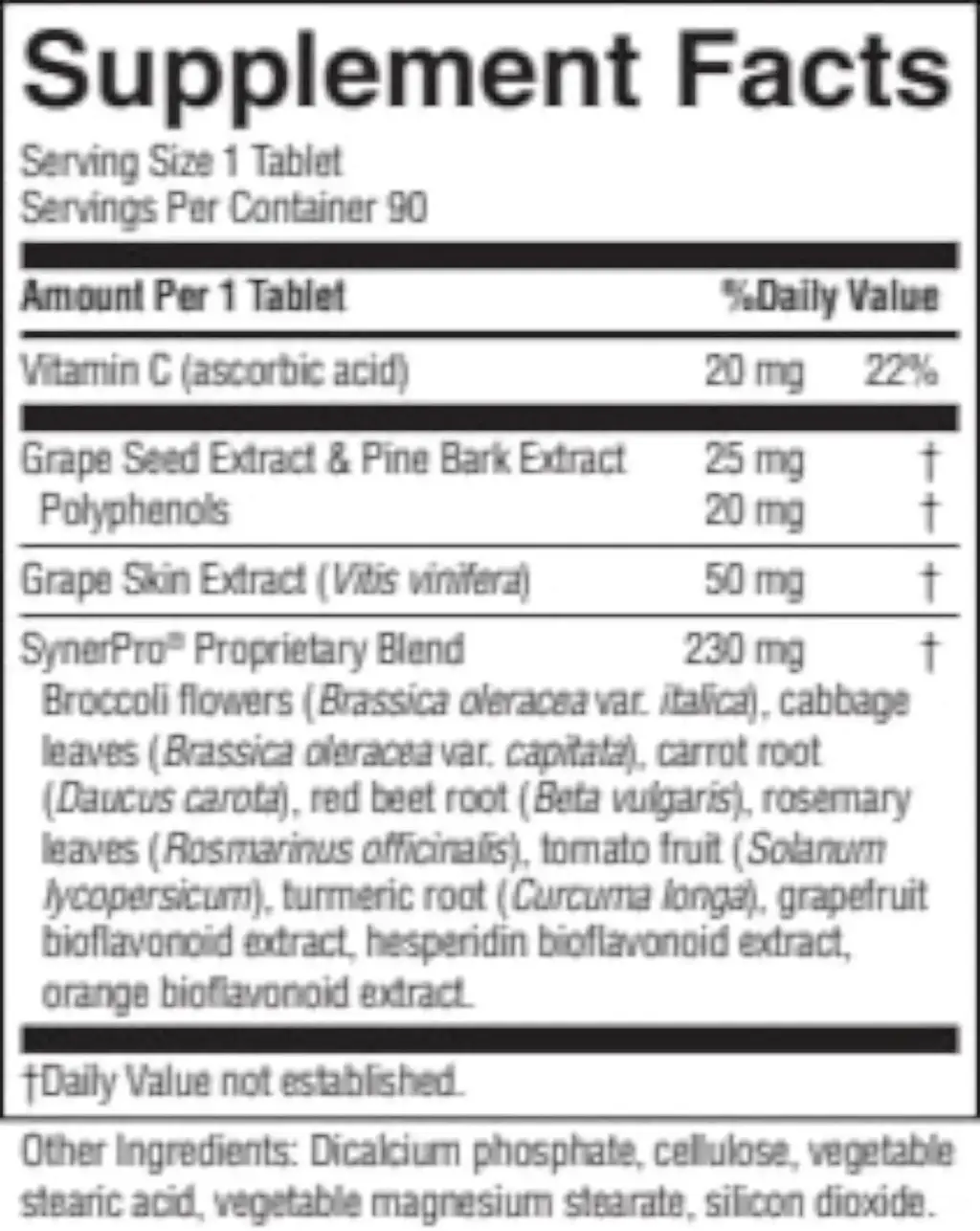 | Proprietary Blend: Broccoli flowers, cabbage leaves, carrot root, red beet root, rosemary leaves, tomato fruit, turmeric root, grapefruit and orange bioflavanoid extracts, hesperidin, orange bioflavonoid extract | 230 mg |