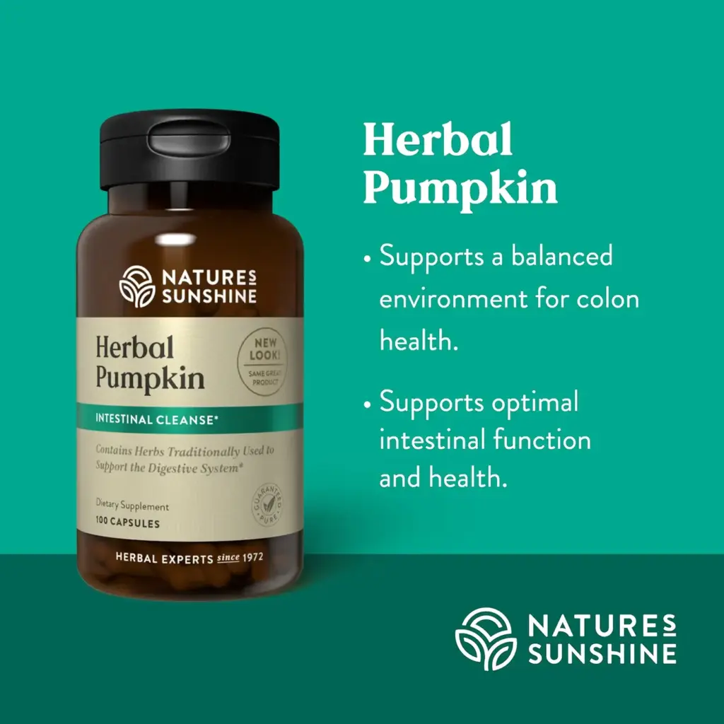 Nature’s Sunshine Herbal Pumpkin combines pumpkin, black walnut, and chamomile to offer nourishment that balances the microbiological environment of the intestines. Five other herbs join together in Herbal Pumpkin that further support intestinal function through cleansing and lubricating the system.