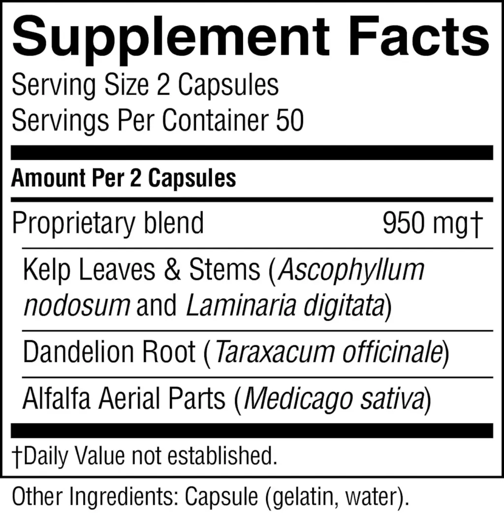 | Proprietary Blend: Kelp leaves and stems, dandelion root, alfalfa aerial parts | 950 mg |