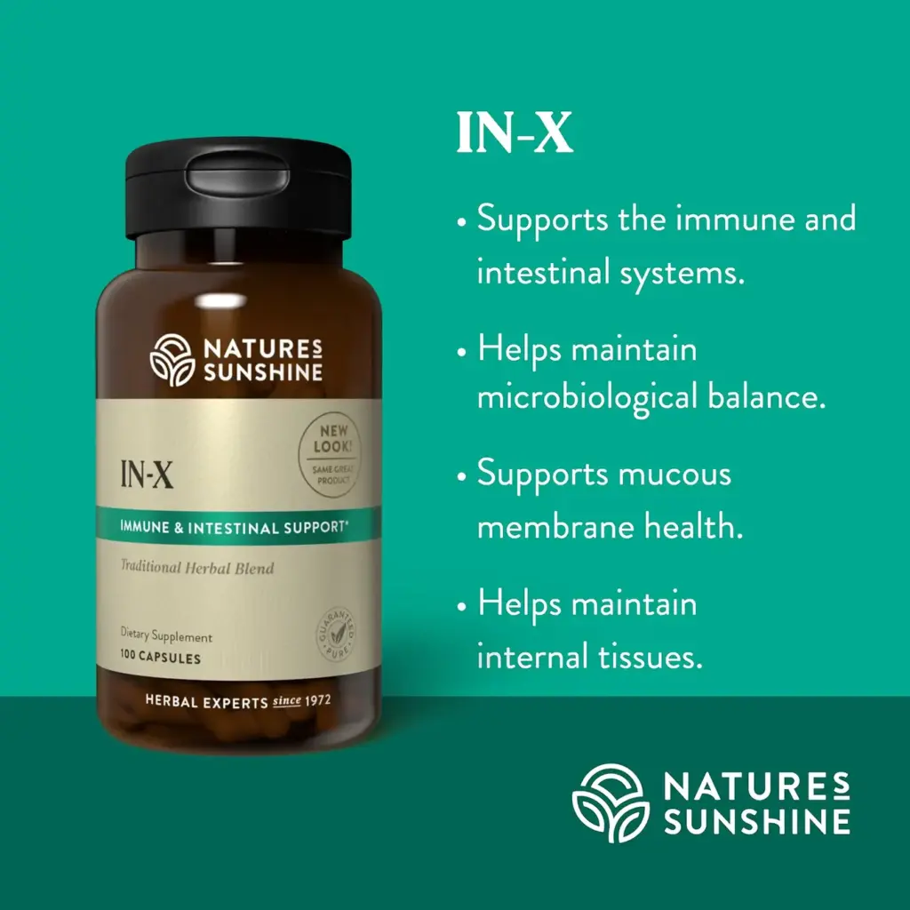 Nature’s Sunshine IN-X formula combines herbs known for their digestive nourishment and immune system supprt. Golden seal, black walnut hulls, althea, parthenium, and bugleweed all come together to in one powerful capsule. Golden seal, champion of the immune system, balances the microbiological environment of the immune system while parthenium, similar in properties to echinacea, further nourishes the immune system. Black walnut hulls cleanse the body’s systems, and the mucilage in althea provides mucous membrane support. Plantain nourishes tissue health, and last but not least, bugleweed provides respiratory support.