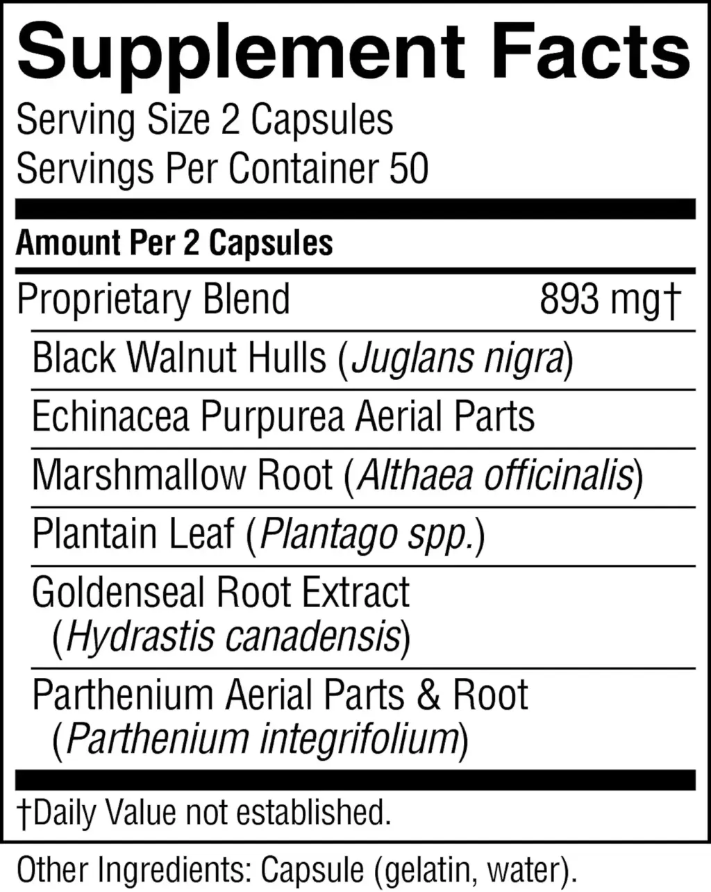 | Proprietary Blend: Black walnut hulls, echinacea aerial parts, marshmallow root, plantain leaves, goldenseal root extract, parthenium root | 893 mg |