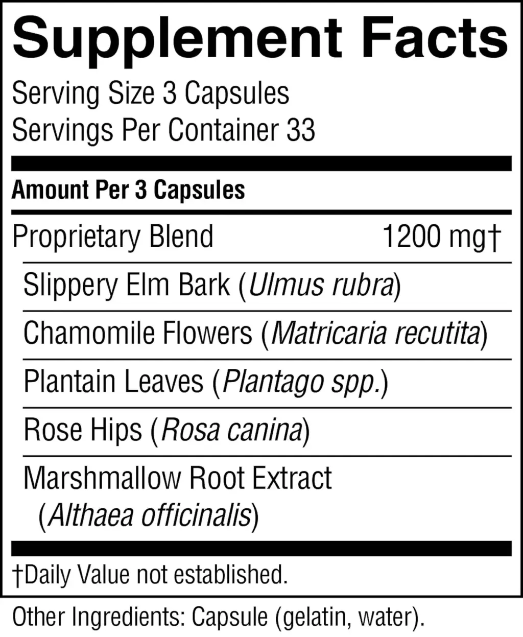 | Proprietary Blend: Slippery elm bark, chamomile flowers, plantain leaves, rose hips, marshmallow root extract | 1,200 mg |