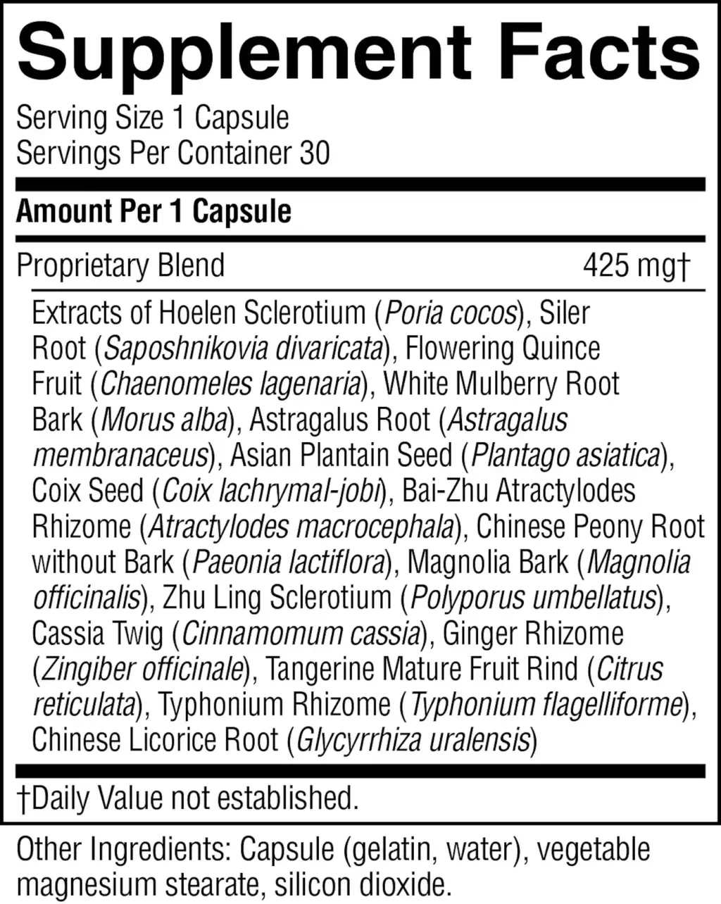 | Proprietary Blend: Hoelen sclerotium, siler root, chaenomeles fruit, morus root bark, astragalus root, plantago seed, coix seed, atractylodes rhizome, peony root without bark, magnolia bark, polyporus sclerotium, cinnamon twig, ginger rhizome, citrus peel, typhonium rhizome, licorice root | 425 mg |