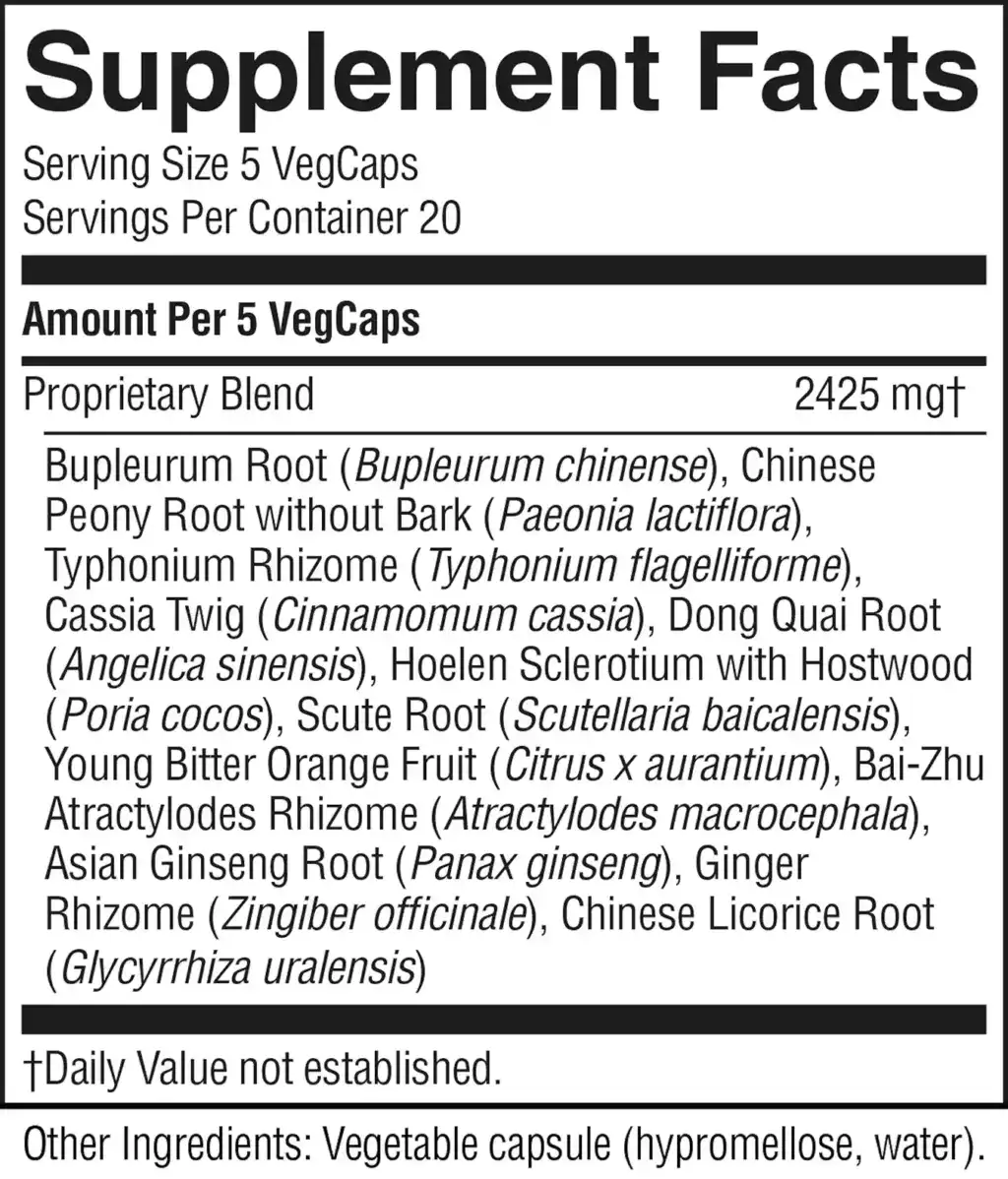 | Proprietary Blend: Bupleurum root, peony root without bark, typhonium rhizome, cassia twig, dong quai, hoelen sclerotium with root, scute root, young bitter orange fruit, atractylodes rhizome, ginseng root, ginger rhizome, licorice root | 2,425 mg |