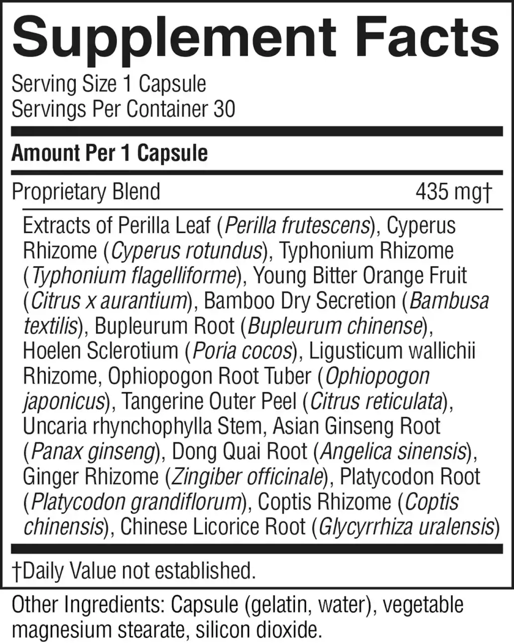 | Proprietary Blend: Perilla leaves, cyperus rhizome, typhonium rhizome, aurantium peel, bamboo sap, bupleurum root, hoelen sclerotium, lingusticum wallichii rhizome, ophiopogon root tuber, tangerine outer peel, uncaria rhynchophylla stem, ginseng root, dong quai root, ginger rhizome, platycodon root, coptis rhizome, licorice root | 435 mg |