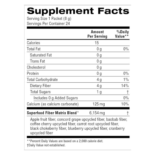 Proprietary Blend: Apple fruit fiber, concord grape uncycled fiber, baobab fiber, coffee cherry uncycled fiber, carrot root upcycled fiber, black chokeberry fiber, blueberry upcycled fiber, cranberry upcycled fiber | 6,154 mg |