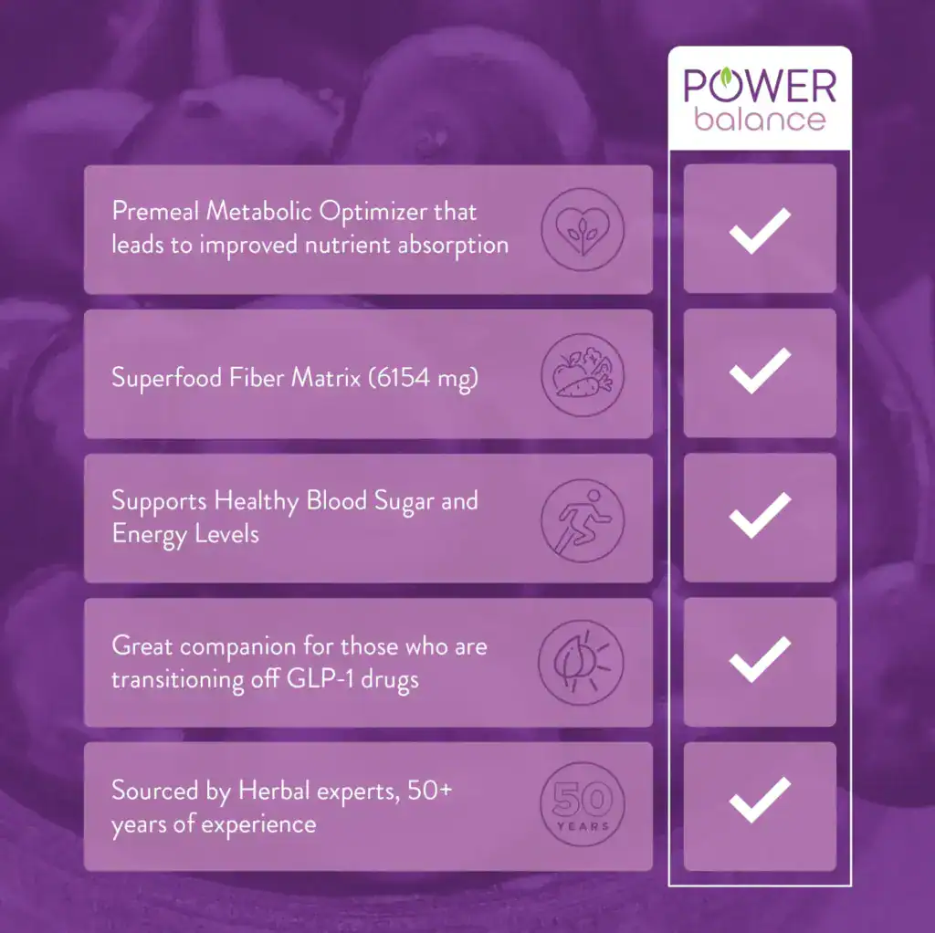 Power Balance is a metabolic optimizer made from carefully selected whole foods and functional fibers. This 100% vegan, gluten-free, non-GMO formula helps you take control of your metabolic health in powerful ways.