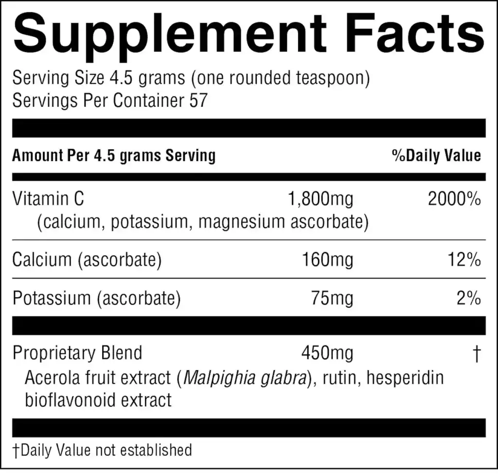 | Proprietary Blend: Acerola fruit extract, rutin, hesperidin bioflavonoid extract | 450 mg |
