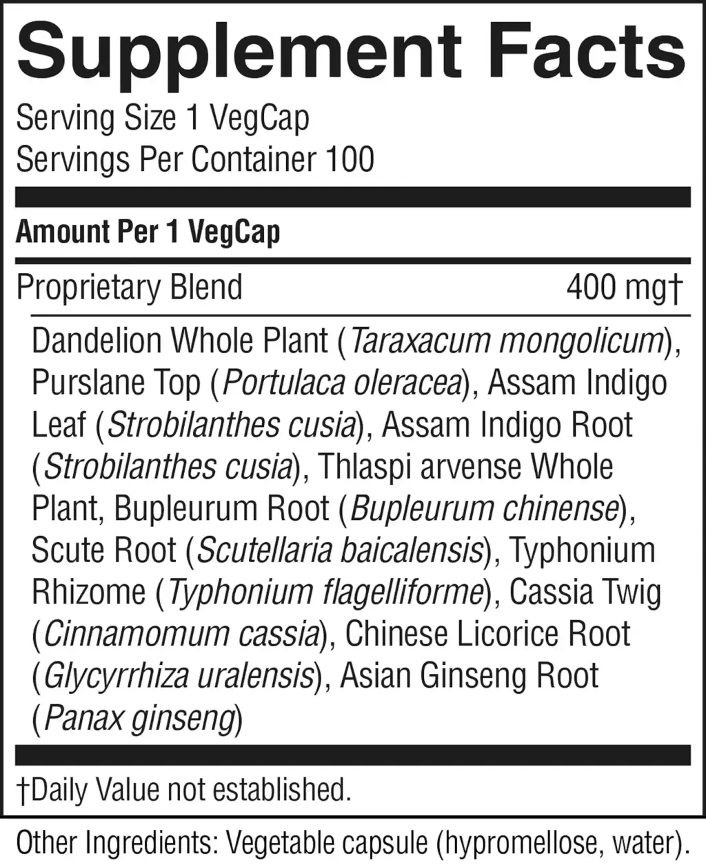 | Proprietary Blend: Dandelion whole plant, purslane tops, indigo leaves and root, assam indigo root, thlaspi whole plant, bupleurum root, scute root, typhonium rhizome, cassia twig, licorice root, ginseng root | 400 mg |
