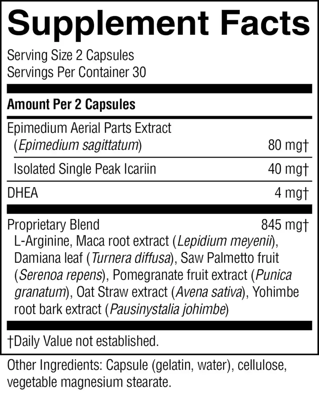 This formula contains l-arginine, damiana leaf, muira puama stem extract, oatstraw extract, saw palmetto fruit, epimedium leaf extract standardized for icariin content, maca root extract, pomegranate fruit extract, yohimbe root bark extract, and DHEA.